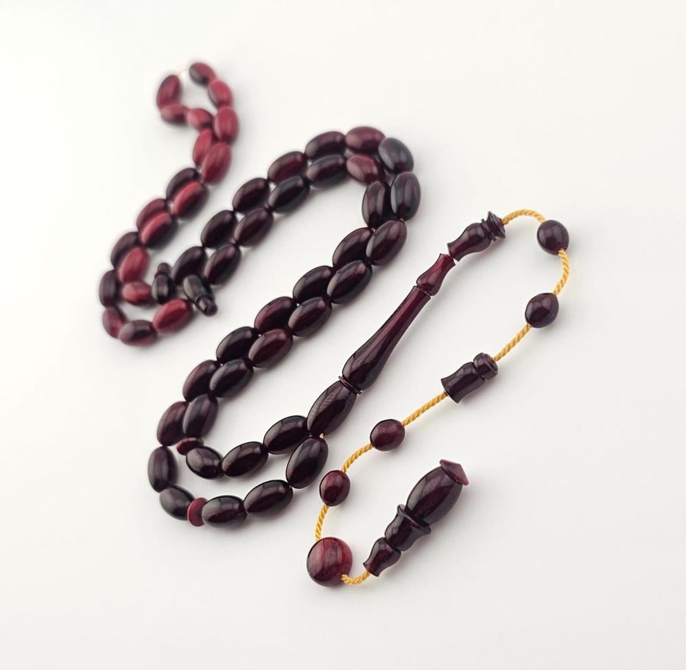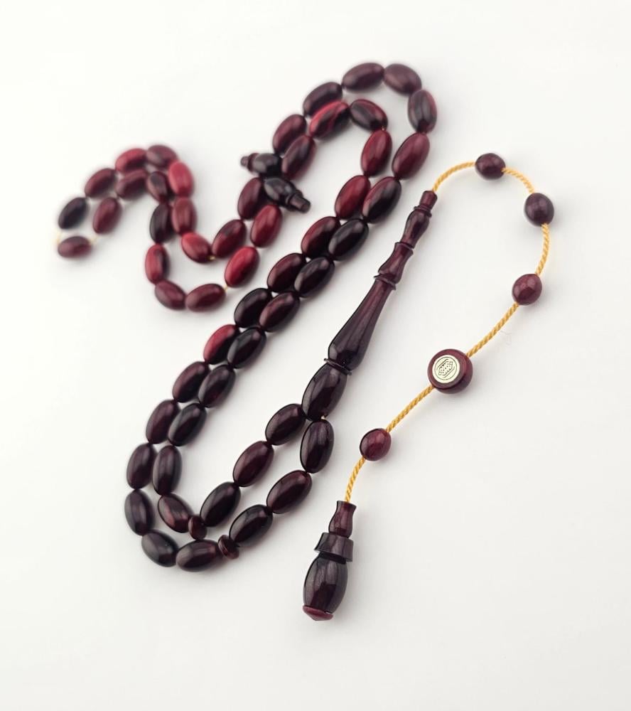سبحه من خامة عصي الفاتوران صب جديد المميزة بكثافتها وتعريقتها بلون عنابي معرق خراطة يدوية بخرز صنوبري قياس 5.5 في 9.5 ملم منظومه من 53.