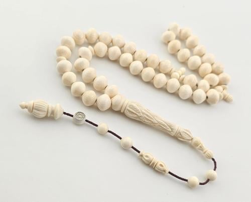 سبحه من عاج الفيل بخرز كروي قياس 9.5 ملم بشاهد منقوش منظومه من 45 خرزه بتفاسير وطربزونه فضه بلون فضي فاتح و اسود بتصميم حلقي ثلاثي وعقده وسطيه باطراف ثلاثيه بوزن 13.5 غرام عيار 1000 الوزن الكلي للمسباح 53.4 غرام