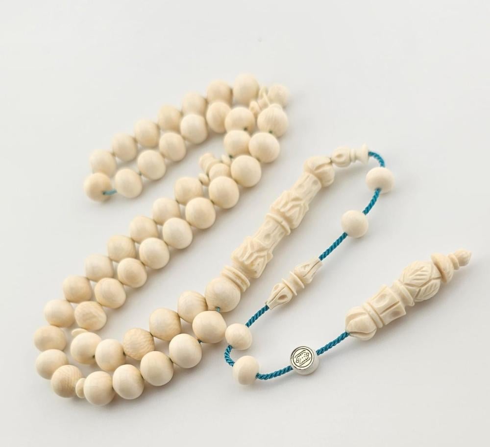 سبحه من عاج الفيل, 45 خرزه ذروي 8 ملم وشاهد منقوش.