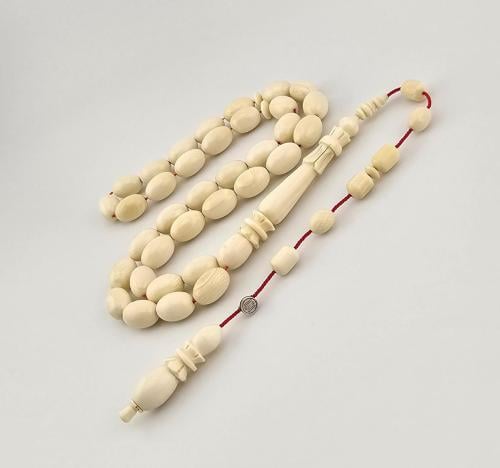 سبحه من عاج الفيل, 35 خرزه زيتوني 13.5 في 11 ملم وشاهد منقوش.