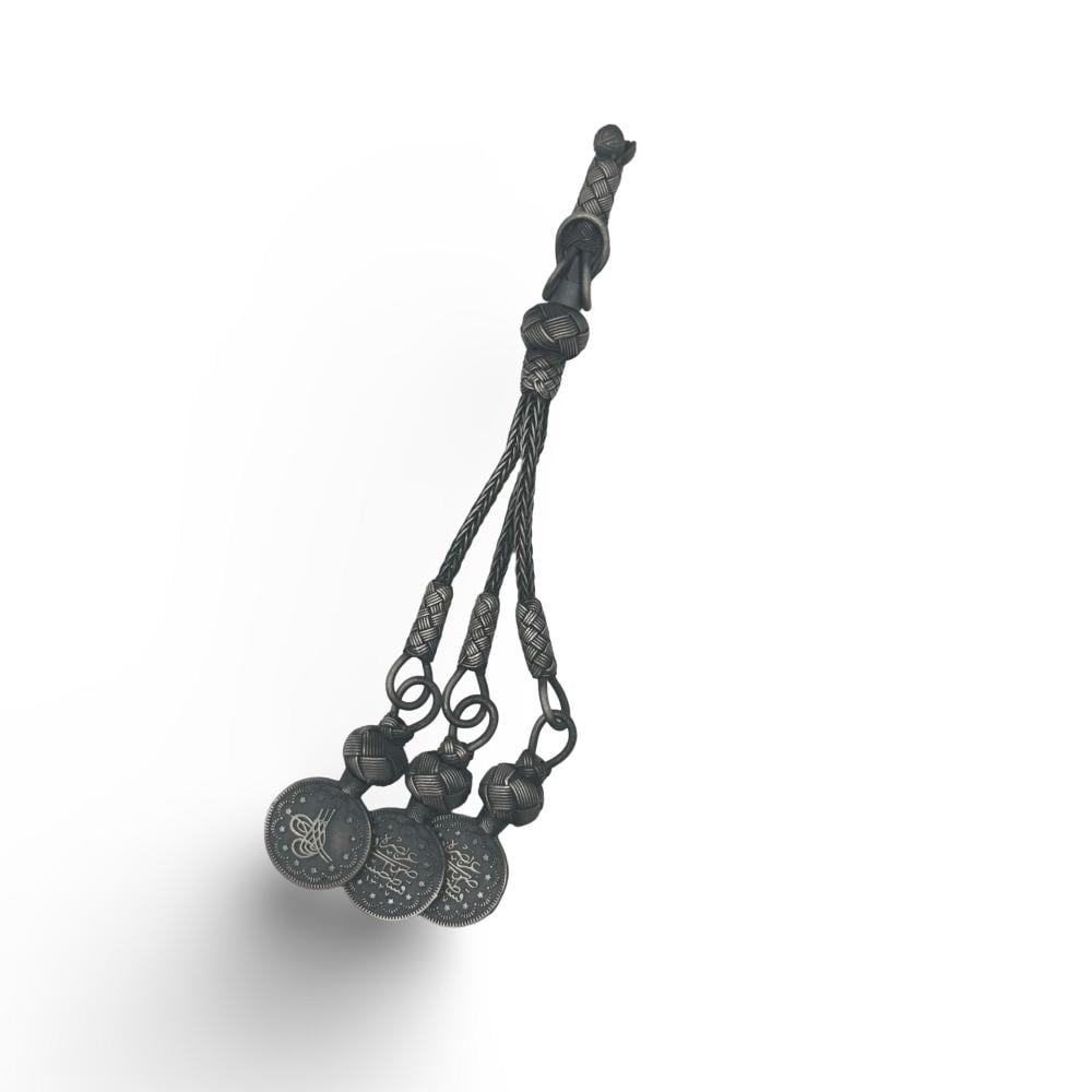 طربزونه فضه بلون فضي غامق بتصميم يدمج بين الطربزونه والفضه الحلبيه ياطراف ثلاثيه مستوحاه من الفضه الحلبيه ومشبك كبس. عيار 1000 الوزن 14 غرام
