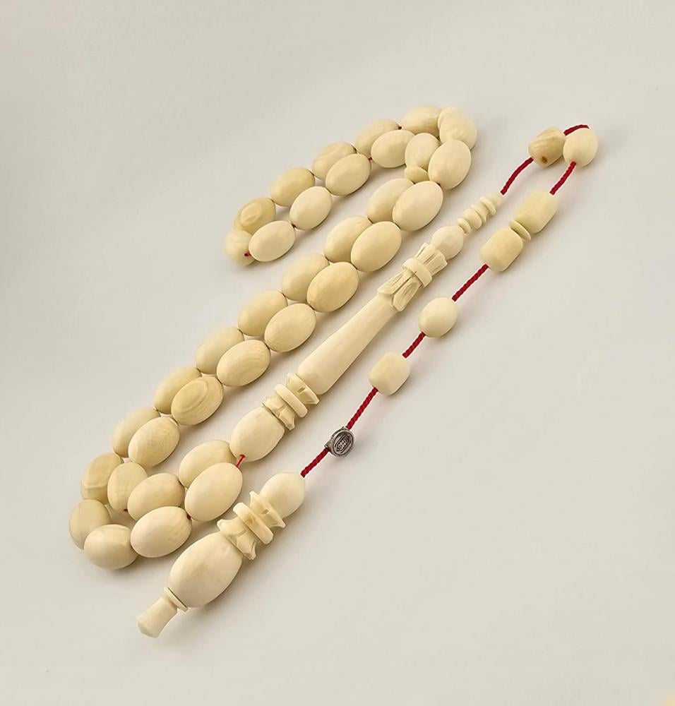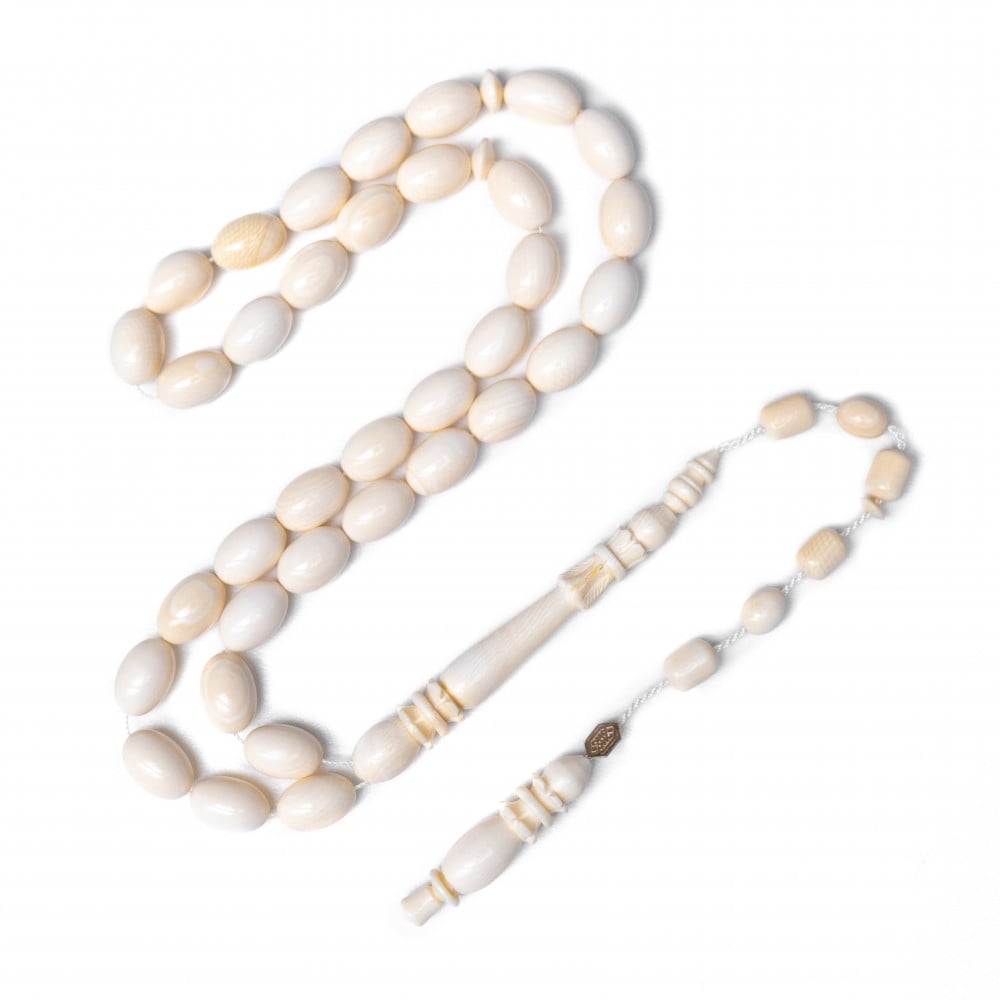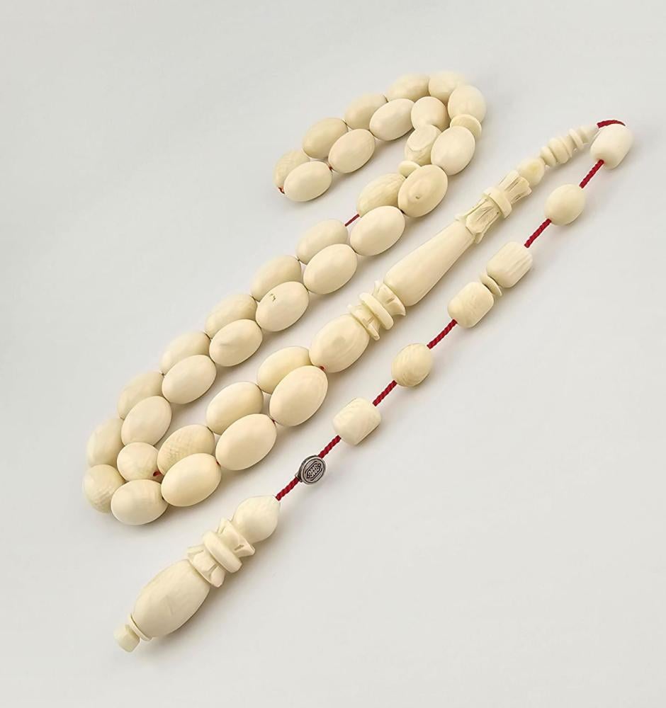 سبحه من عاج الفيل خراطه يدويه بشكل بيض الحمام قياس 12.5 مم في 8 مم. منظومه من 35 خرزه بتفاسير وتمليكه وشاهد طوله 60 مم منقوشه. الوزن 36 غرام.