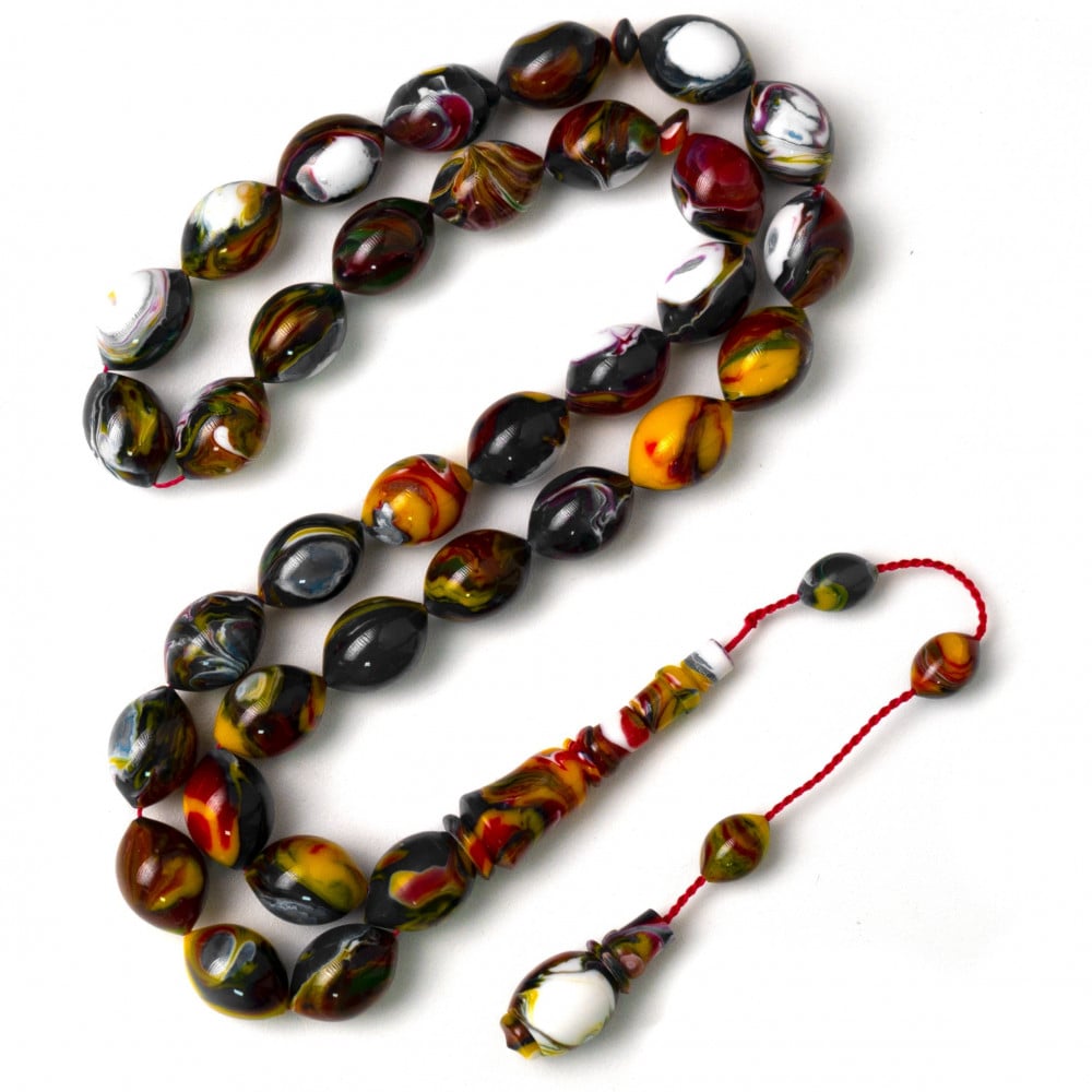 سبحه من البكلايت بالوان مختلفه خراطه يدويه بخرز زيتوني قياس 13.5 ملم في 10.5مم. منظومه من 33 خرزه بتفاسير وشاهد طوله 37 ملم. الوزن 35 غرام.