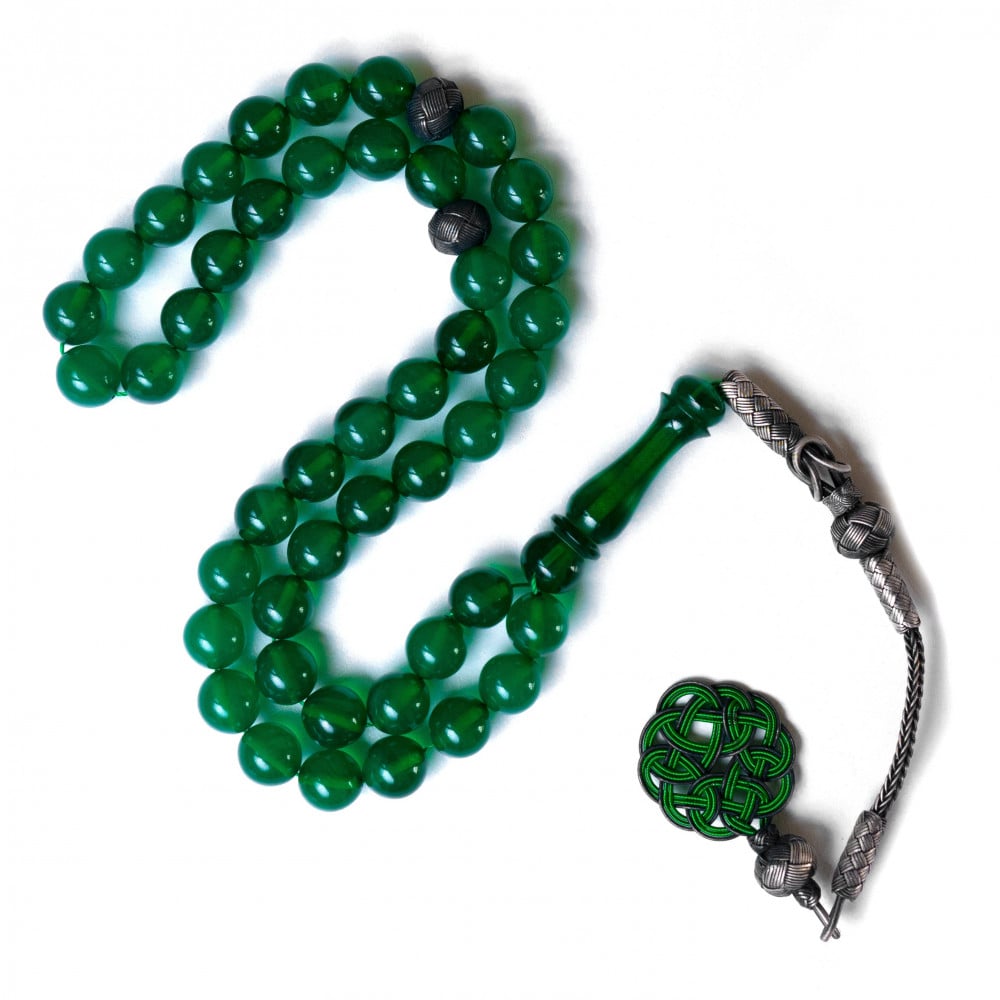 سبحه من البكلايت باللون الاخضر بخرز كروي قياس 8.5 ملم. منظومه من 45 خرزه بتفاسير وطربزونه من الفضه عيار 1000.
